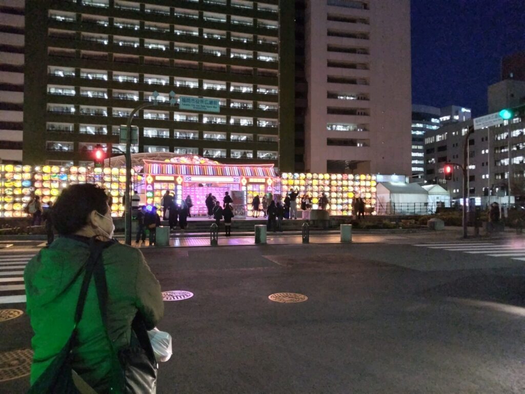福岡市役所の前に行くと、賑やかな灯りが点いています。