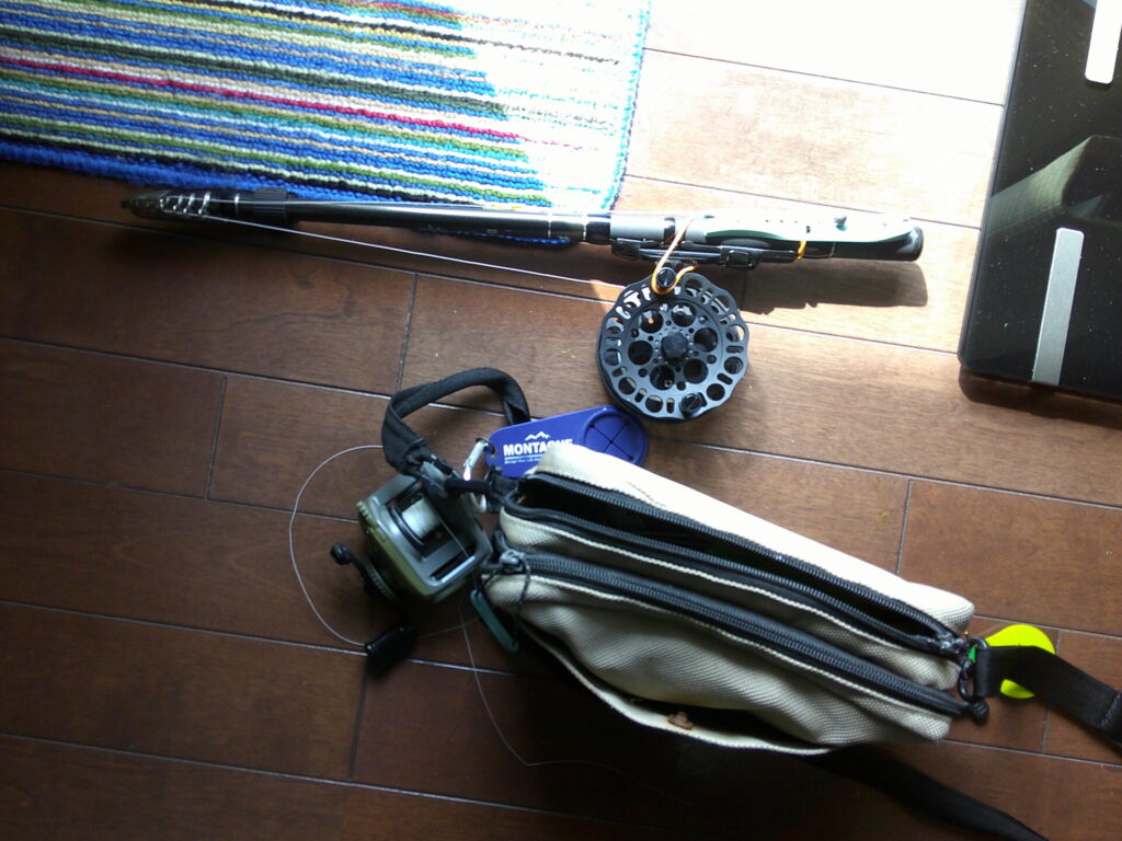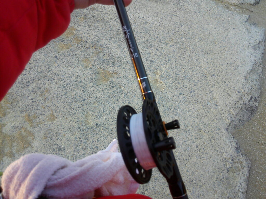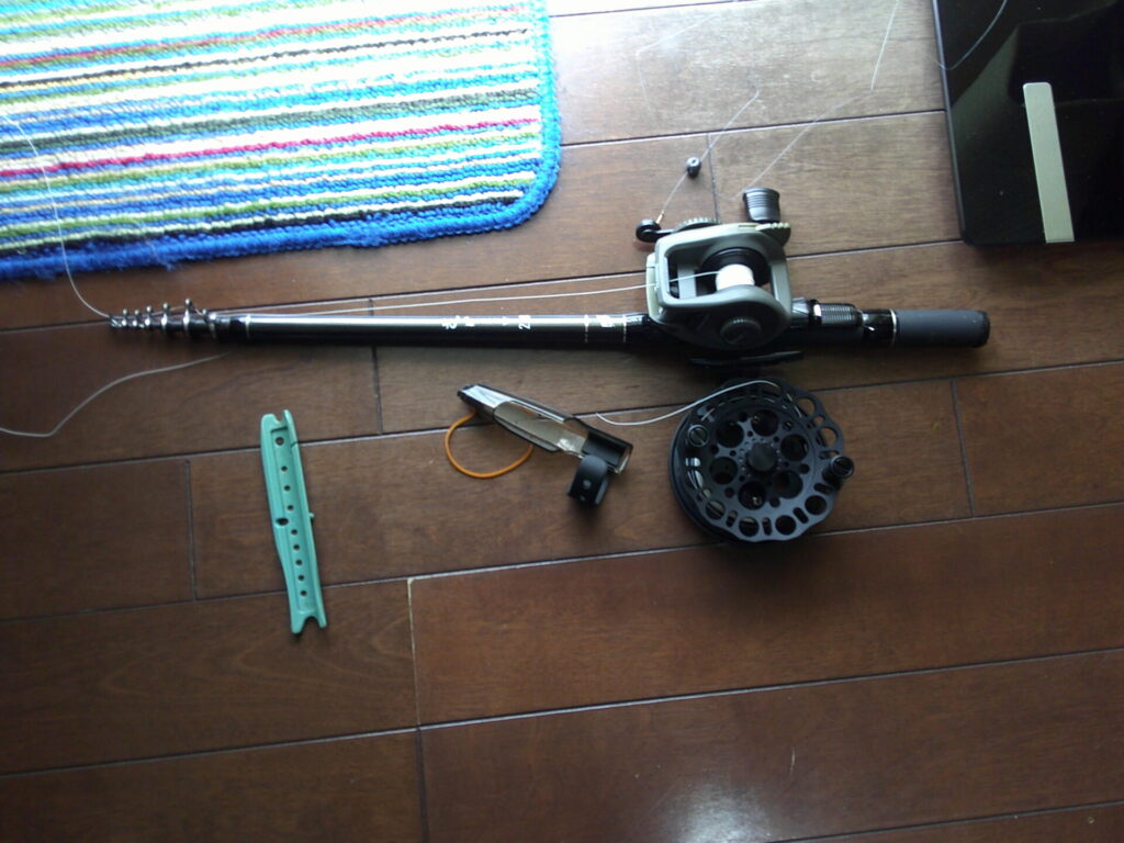 いつでも竿が出せるように、振り出し式のヘチ探り用のコンパクトロッドに付けられていた、シマノの小型両軸リールを、海底まで探れるようにヘチリールに交換しました。