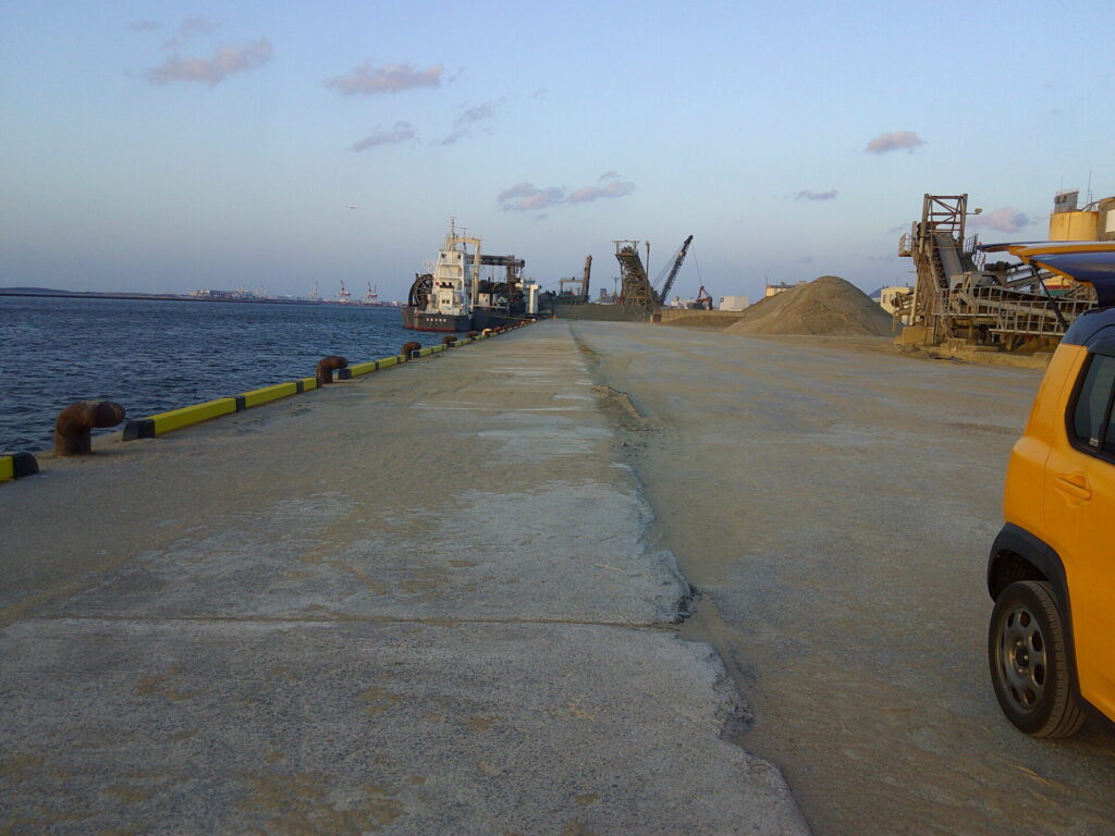 東浜の砂山は、日曜日の夕方6時半過ぎだというのに、クレーンで船から砂を下ろしていました。