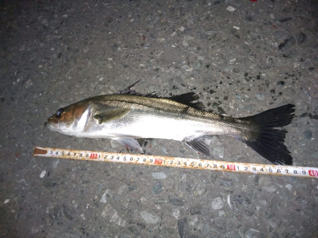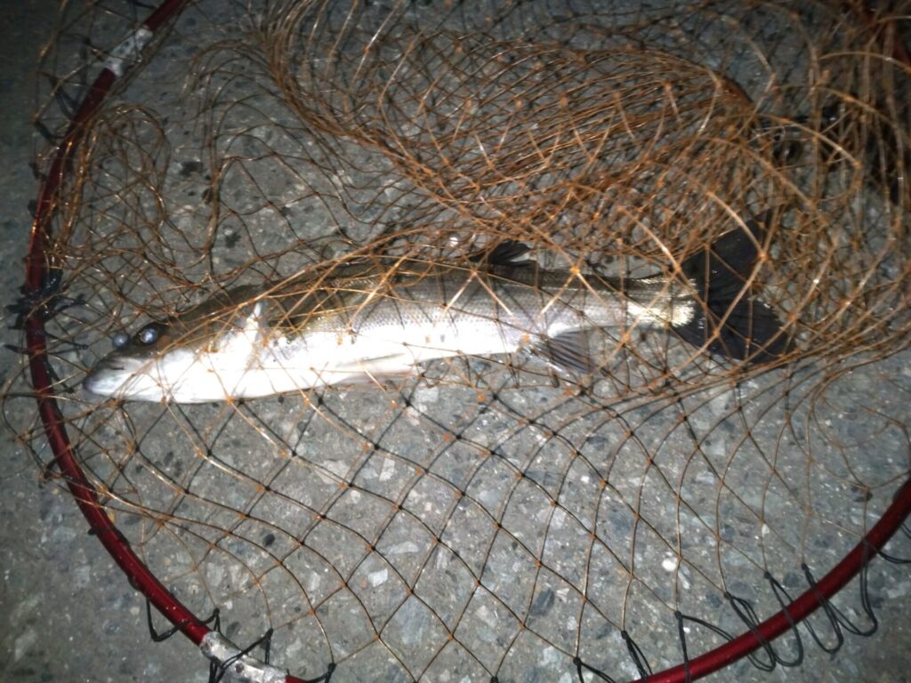 マジでほとんどアタリがない数少ないアタリをモノにするためにタモで掬いましたが、本来はタモで掬うには大袈裟な40センチ弱の痩せたシーバスです。